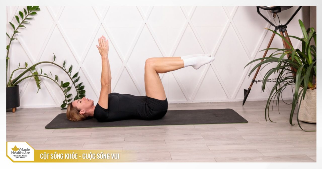 - Thực hiện: Nằm ngửa, gối co, bàn chân đặt trên sàn. Thở ra, siết cơ bụng và ấn chặt lưng dưới xuống sàn, giữ 5 giây rồi thả lỏng.