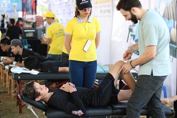 Các vận động viên háo hức đăng ký tại quầy của Maple để được massage và điều trị chấn thương miễn phí